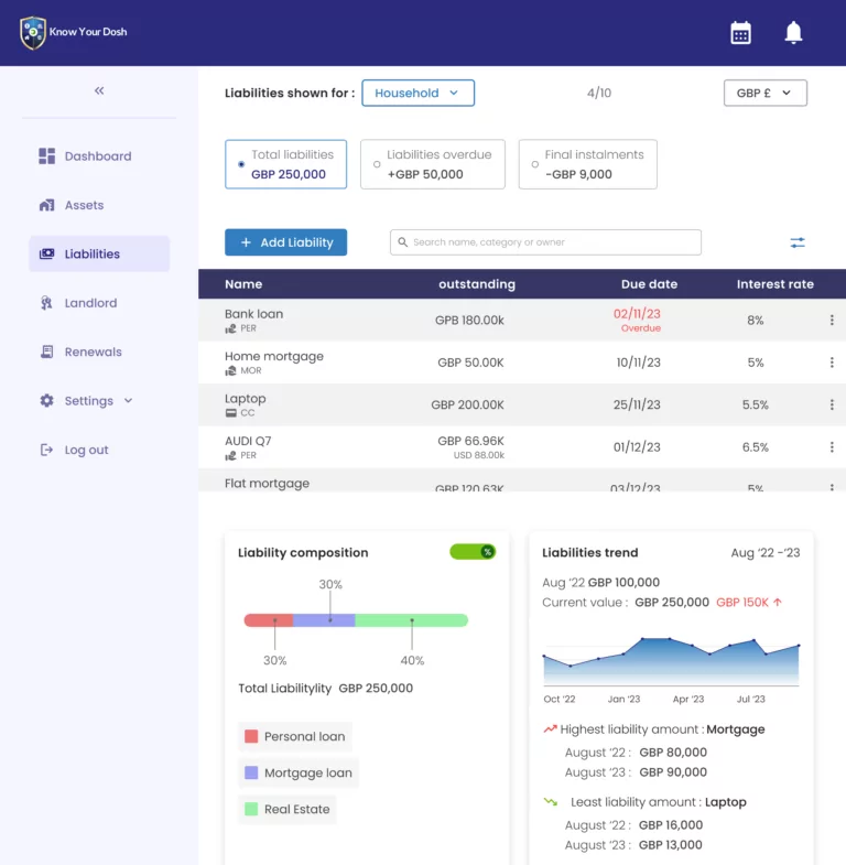 Use Case: “The Peterson family has mortgages on their London home and Toronto investment property. Know Your Dosh tracks both loans with local currency rates and payment schedules, helping them save £15,000 annually through insight to optimise payments.”
