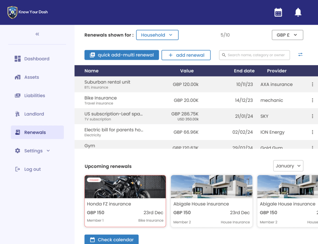 Managing family finances shouldn’t feel overwhelming. Know Your Dosh brings everything into one place. Assets, liabilities and renewals, with a clear household dashboard built for busy families. Join families across 48 countries who are already managing smarter, not harder.